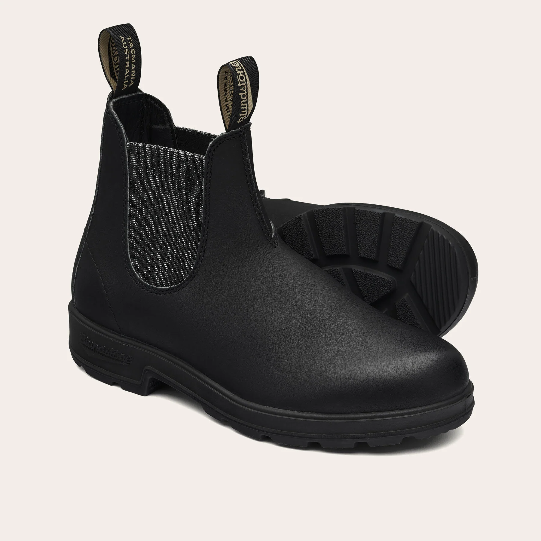 Botas Blundstone #2032 de estilo Chelsea fabricadas en piel negra resistente al agua con elásticos laterales de color plata con purpurina.